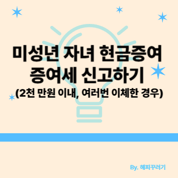 이번 포스팅에서는 미성년 자녀에게 현금을 증여한 경우, 증여세 신고 방법에 대해 자세히 다뤄보겠습니다. 지난 포스팅에서 미성년 자녀의 증여세 공제 한도인 2천만 원에 대해 설명했는데요, 자녀에게 현금을 증여하는 경우, 부모님들은 대부분 자녀의 통장에 용돈이나 세뱃돈을 송금해 주는 방식으로 관리합니다. 저 또한 아이 통장을 개설하고 받은 용돈을 송금해주고 있었는데요, 최근 그 돈을 해외 주식 투자로 불려보려는 계획을 세우면서 증여세에 대한 부분이 문제가 될 수 있다는 사실을 알게 되었습니다. 미성년 자녀가 받은 금액이 10년간 2천만 원을 초과하지 않았다고 해도, 나중에 그 금액을 투자하여 증여세 신고를 하지 않은 상태에서 그 자산이 2천만 원을 넘게 되면, 초과된 금액에 대해 증여세가 부과될 수 있습니다..